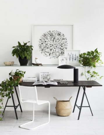 Groene planten mogen natuurlijk niet ontbreken op een werkplek. Planten zorgen ervoor dat de lucht in de ruimte gezuiverd wordt en geven de plek een fris uiterlijk. Je kunt kiezen voor een aantal hangplanten. Die nemen niet zoveel plek in beslag, ideaal!