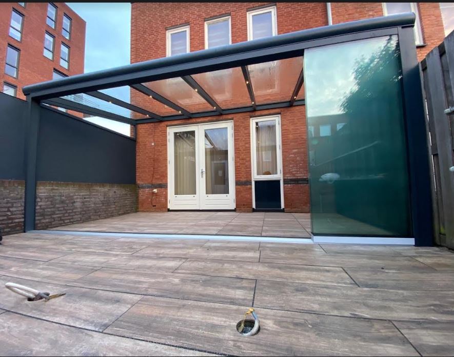 Een overkapping met glazen schuifwanden
